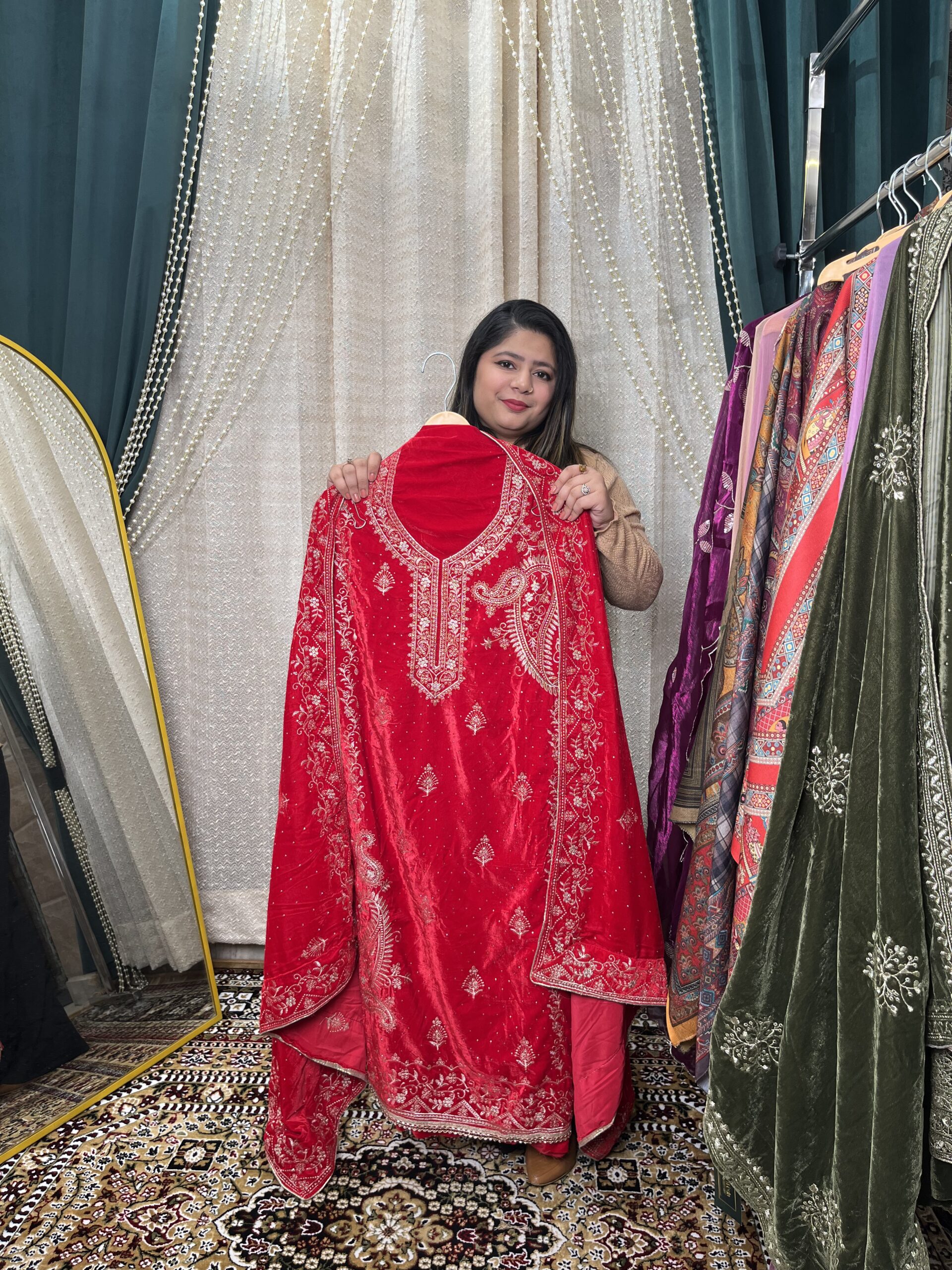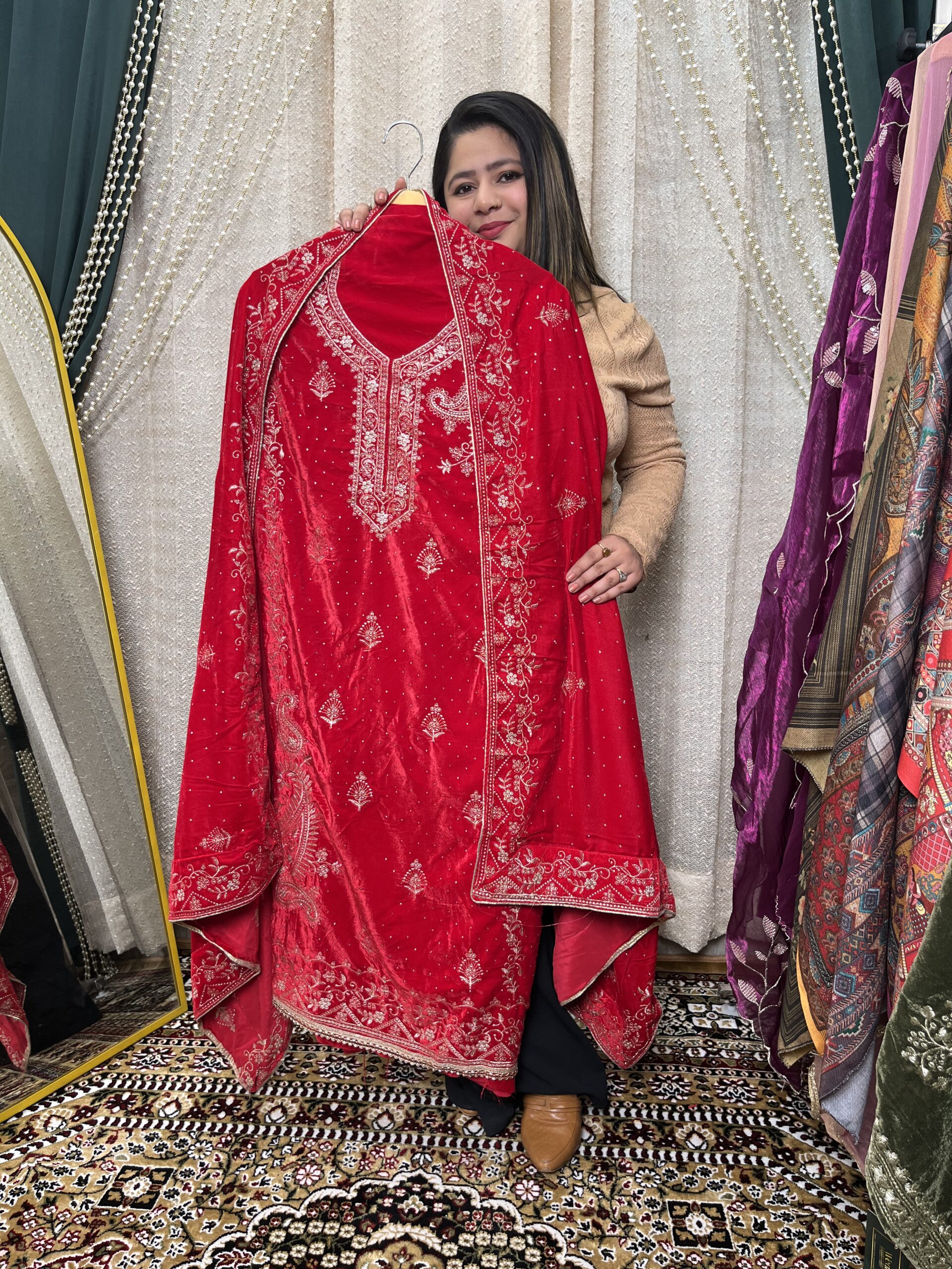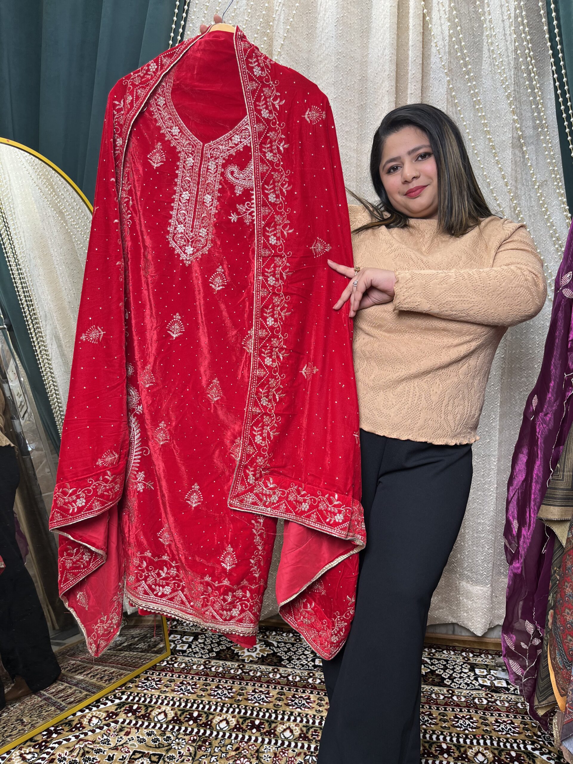 Presenting our very gorgeous bright red Velvet suit, crafted in ultra-premium fabric and adorned with rich Zari work + shimmering stone detailing all over the suit and dupatta.